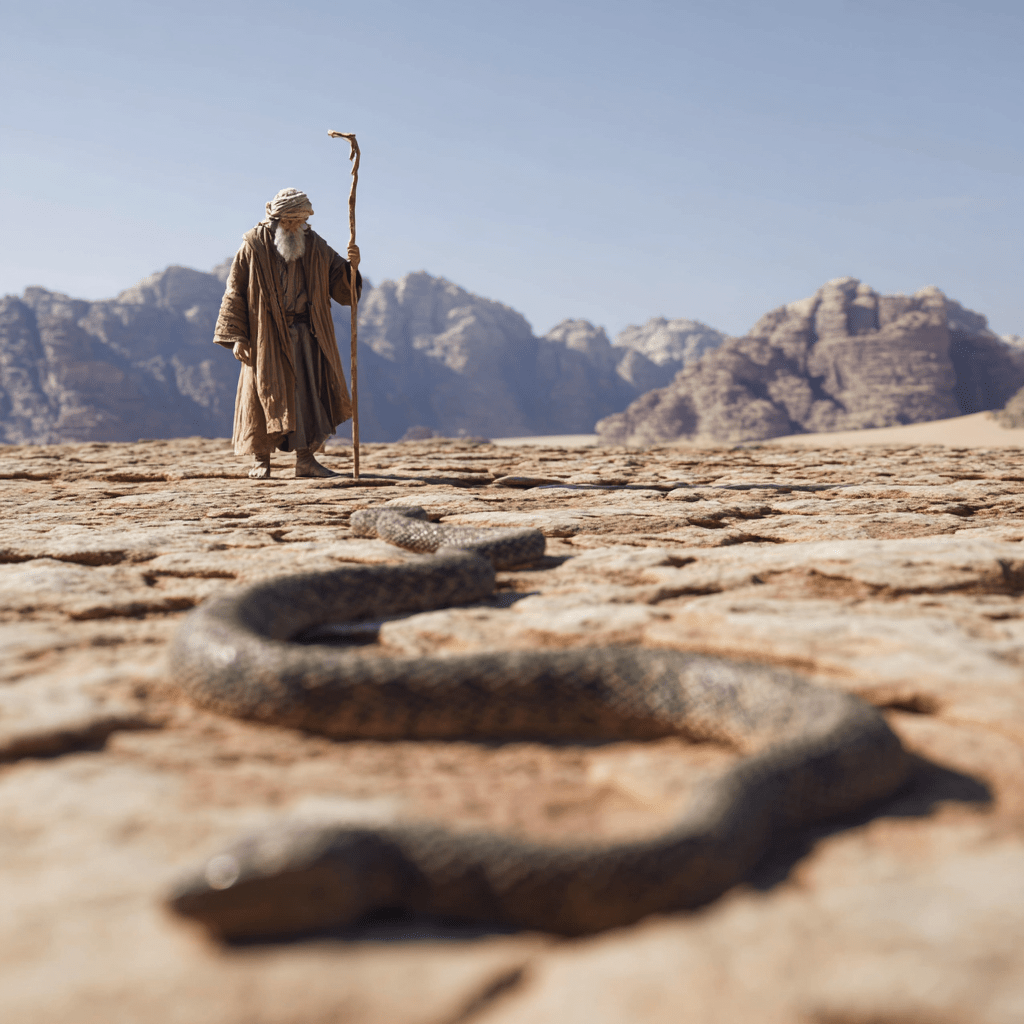 主は「尾をつかめ」と命じる。 - 彼が尾をつかむと、それは再び杖に戻る。