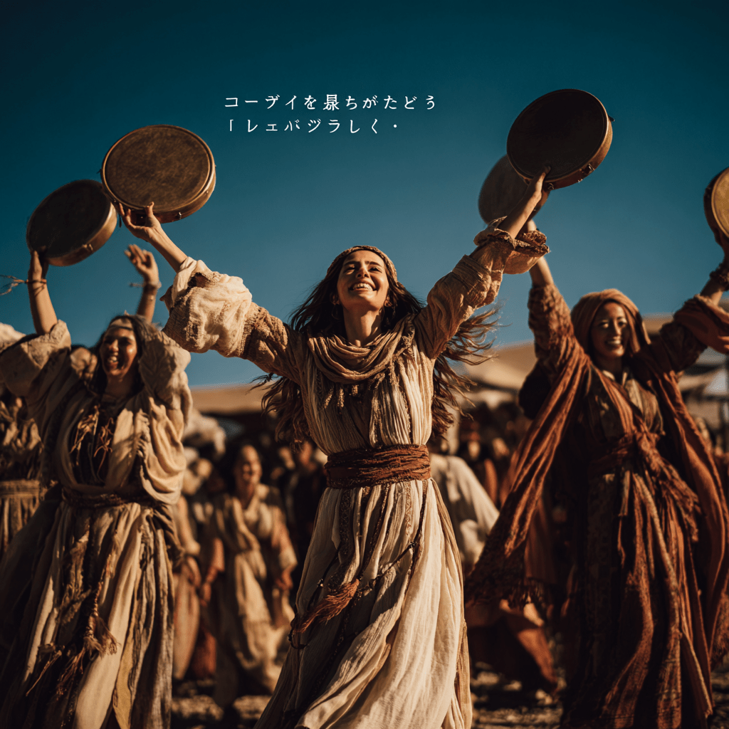 すべての女たちはタンバリンを手にして彼女の後に続き、踊りながら出て来た。」(20節 要旨)