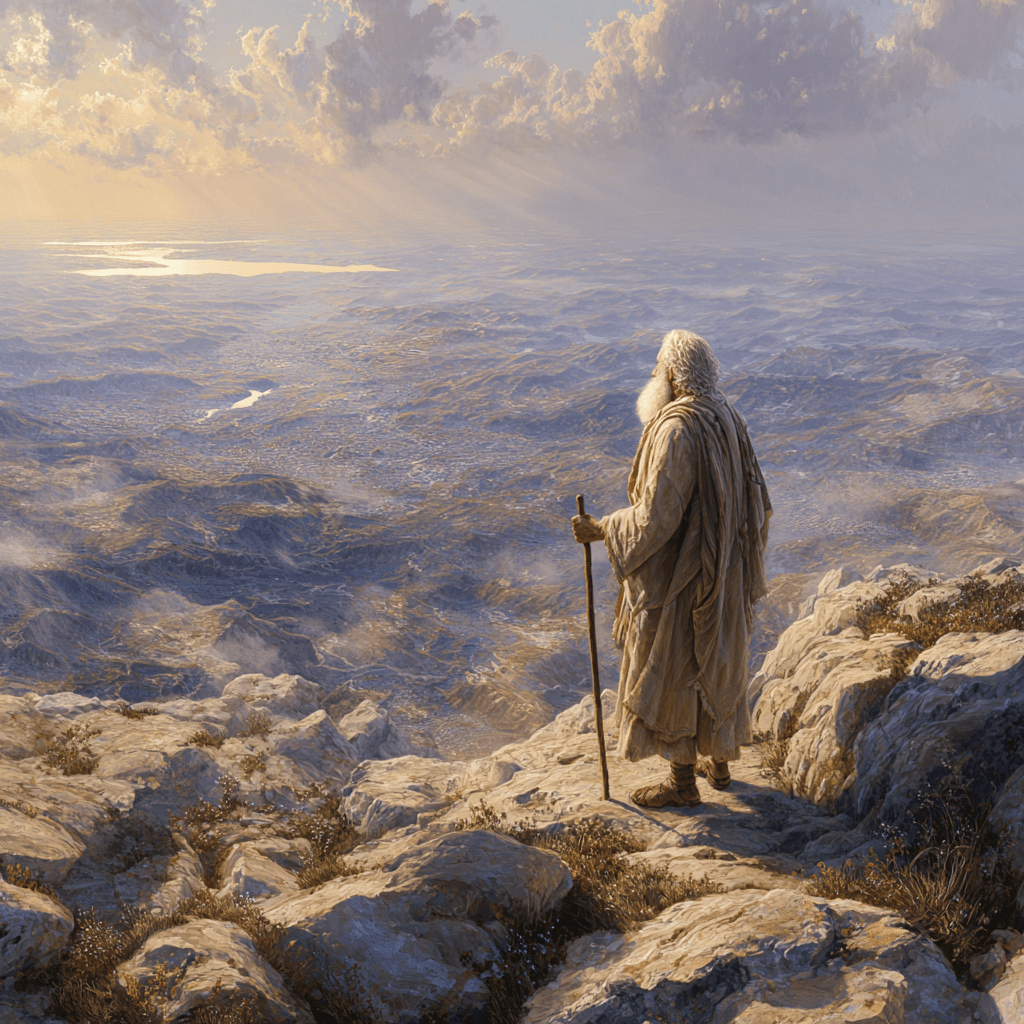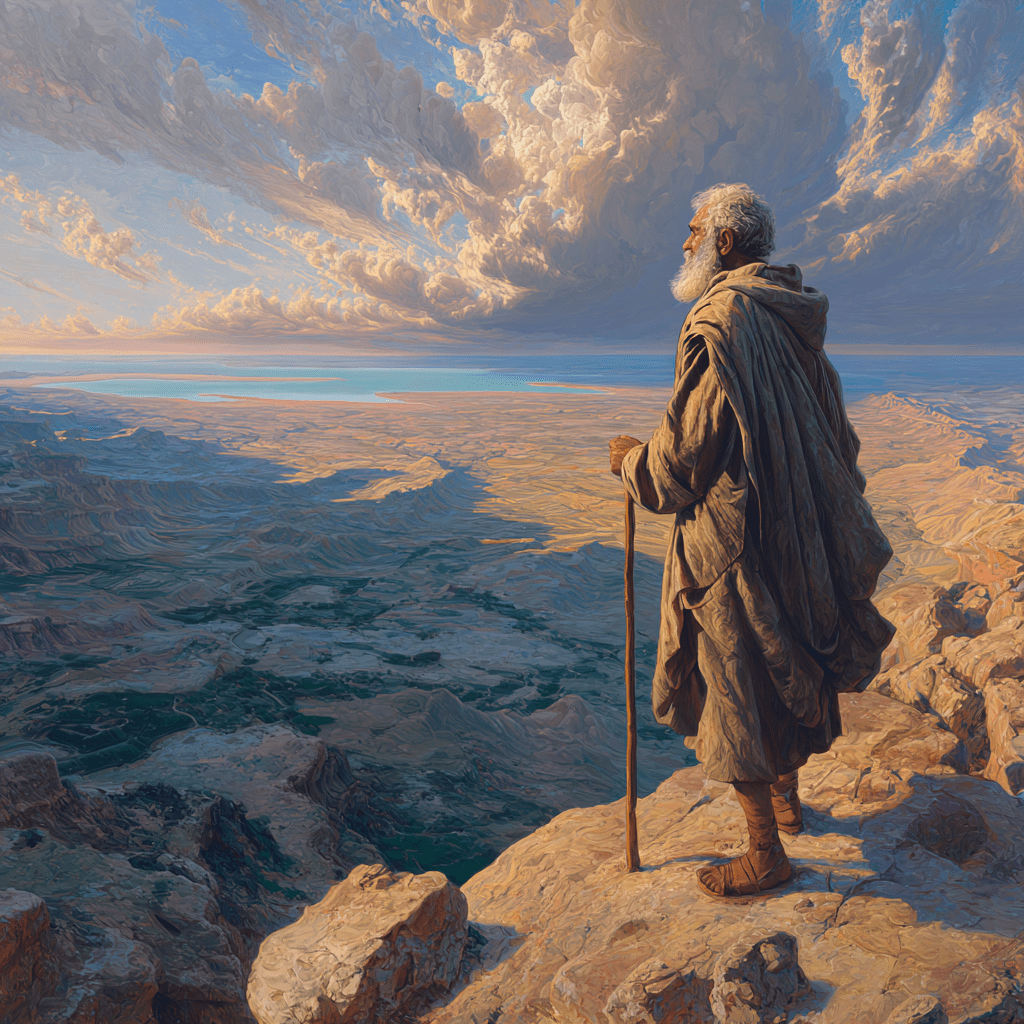 「約束の地全体のパノラマ」を主の手によって見せられる。彼が導いた民が、これから足を踏み入れていく地。