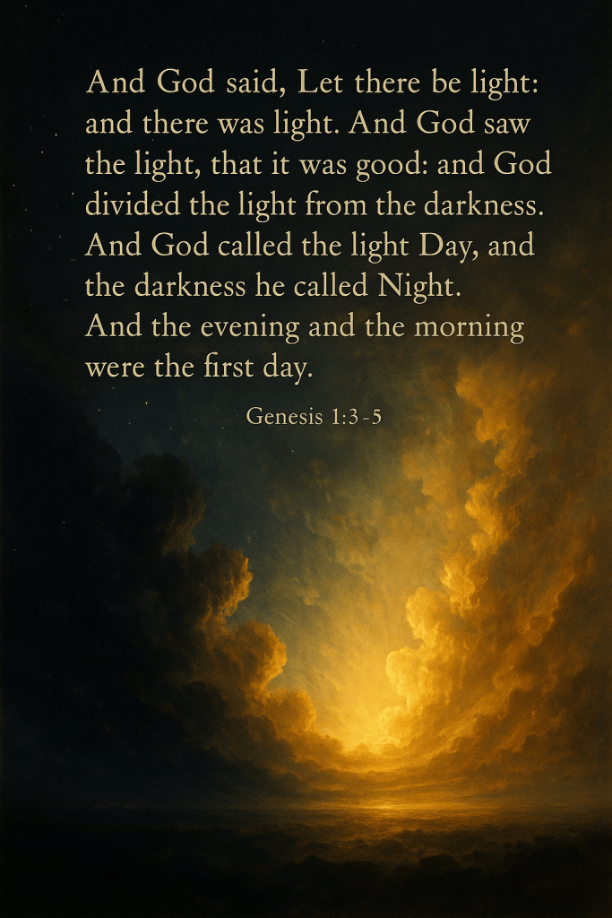 これは、単なる視覚的な光ではなく、秩序の象徴であり、創造の第一歩でした。光と闇の区別は、時間の流れ(昼と夜)の始まりでもあり、すべての創造がここから進行していく布石なのです。