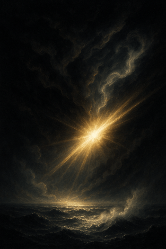創世記の天地創造の第一日目を描いたデジタルペインティング。上空には暗黒と混沌を表す渦巻く黒と青の嵐雲。下には荒れ狂う海。中央には神の黄金の光が爆発するように闇を貫き、光線が外へ放たれて水面を照らす。神の霊が水の上を動くことを暗示するような霧が漂う。高精細、映画的コントラスト、劇的なライティング、8K解像度、絵画的スタイル。